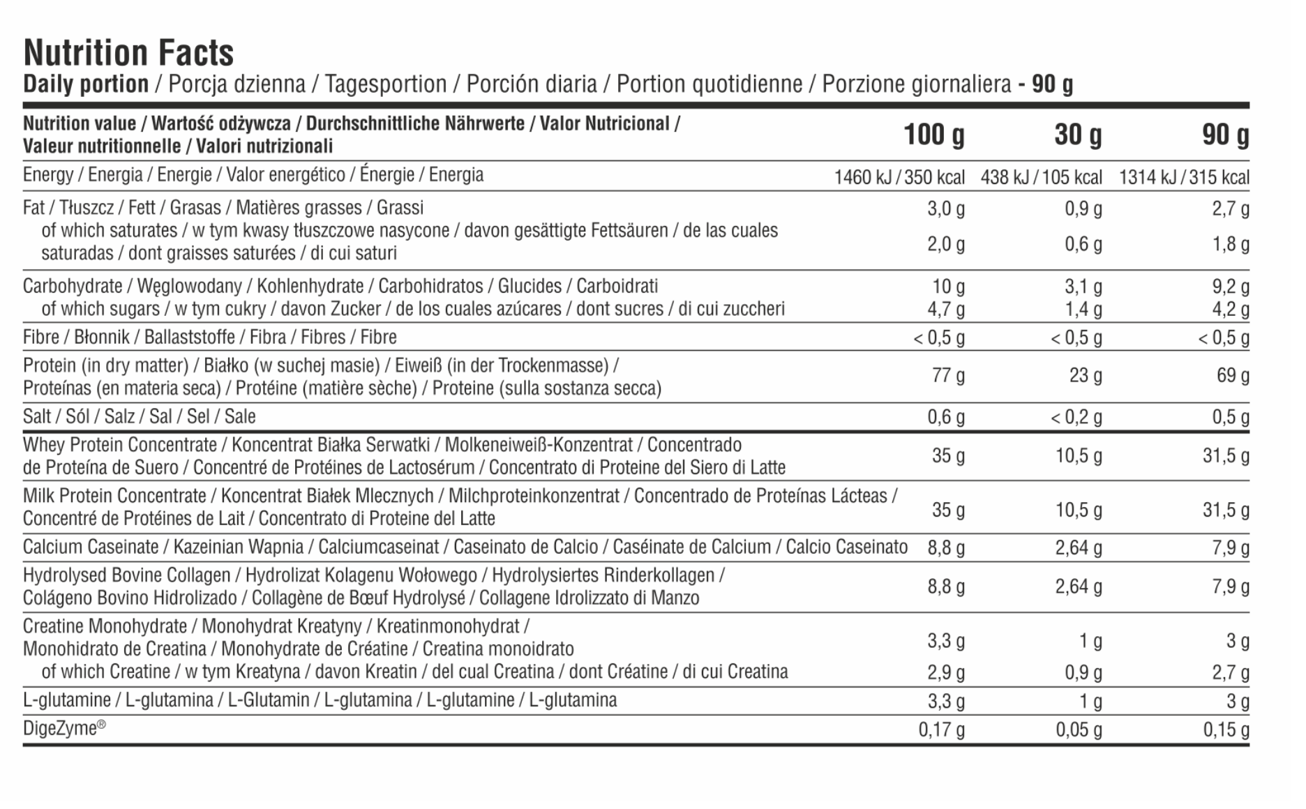 SKŁADNIKI: 35 % koncentrat białka serwatkowego (z mleka); 35 % koncentrat białek mlecznych (z mleka); 8,8 % kazeinian wapnia (z mleka); 8,8 % hydrolizat kolagenu wołowego; monohydrat kreatyny; L-glutamina; wzmacniacz smaku: glicyna; aromat zawierający kakao; stabilizator: guma arabska (E414); DigeZyme® - kompleks multienzymatyczny; substancja słodząca: sukraloza.