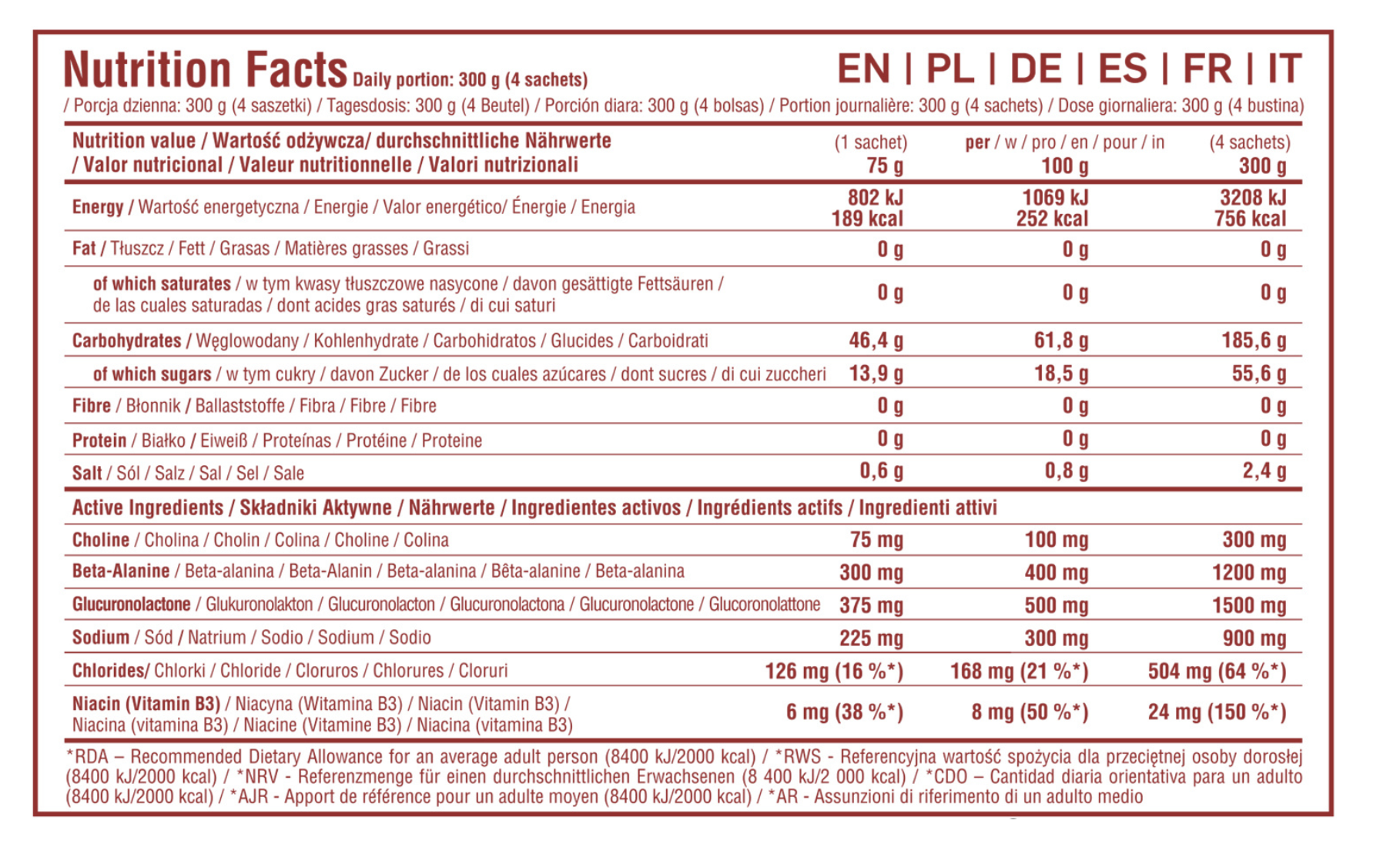 SKŁADNIKI: 49% maltodekstryna; woda; 15% fruktoza; cytrynian sodu; regulator kwasowości: kwas cytrynowy; glukuronolakton; beta-alanina; regulator kwasowości: kwas winowy; dwuwinian choliny; chlorek sodu;
