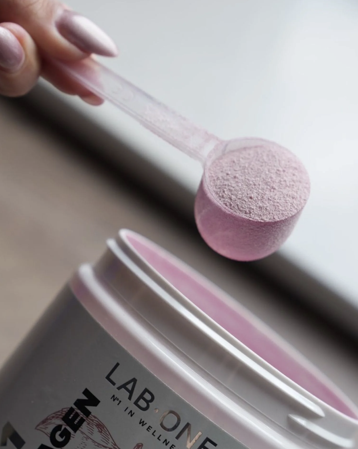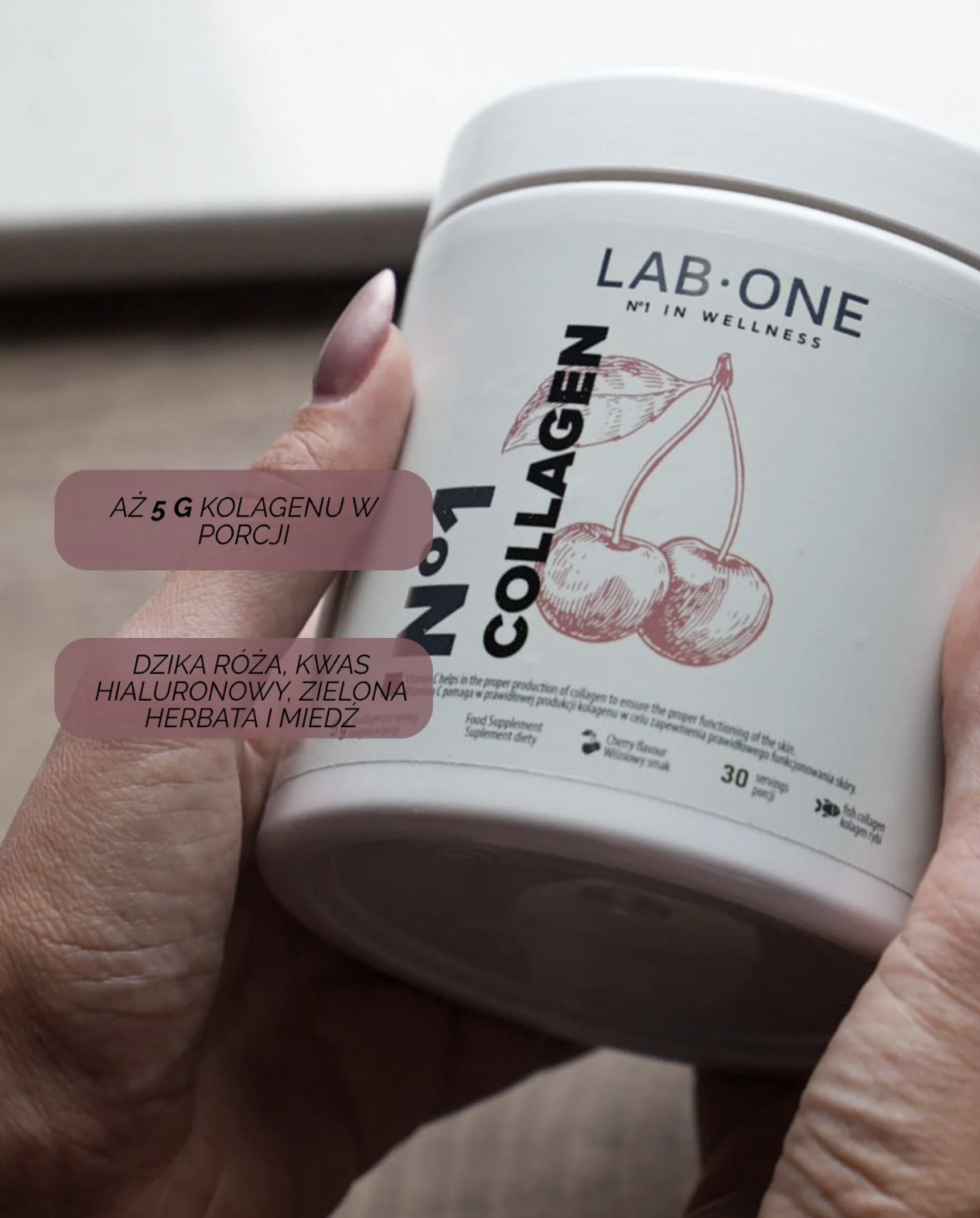 Składniki: hydrolizat kolagenu rybiego, ekstrakt z owocu dzikiej róży (Rosa canina L.) DER 25:1, naturalny aromat wiśniowy z innymi naturalnymi aromatami, zagęszczony sok z buraków w proszku, regulator kwasowości – kwas cytrynowy, kwas hialuronowy (hialuronian sodu), ekstrakt z liści zielonej herbaty (Camellia sinensis (L.) Kuntze) DER 15:1, substancja słodząca – sukraloza, miedź (diglicynian miedzi).